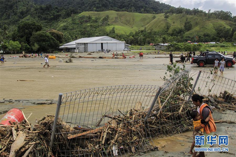 3月17日,在印度尼西亚巴布亚省森塔尼,一名妇女抱着孩子站在被洪水冲垮的围栏旁。