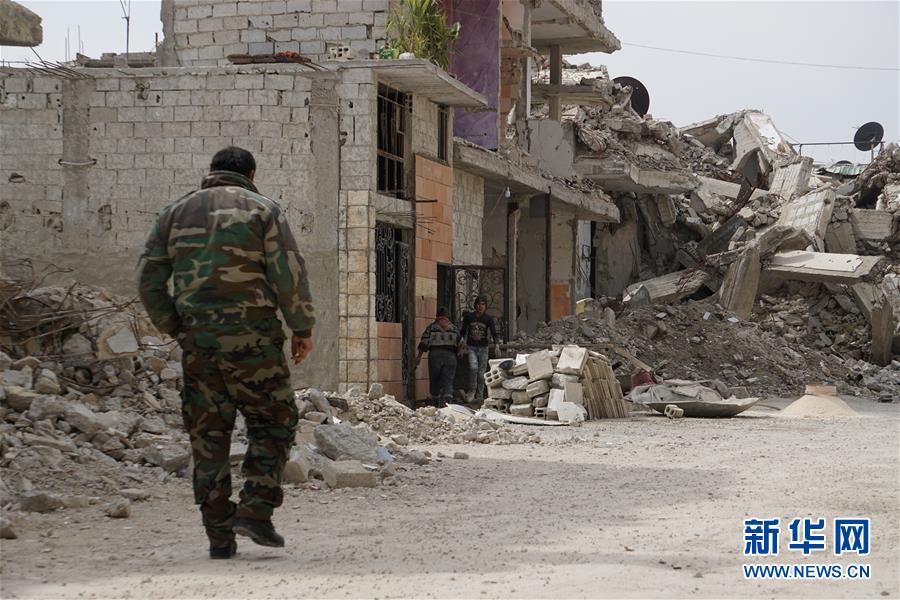 3月12日,在叙利亚大马士革东古塔地区,一名士兵走过一栋正在整修的民居。 新华社记者汪健摄