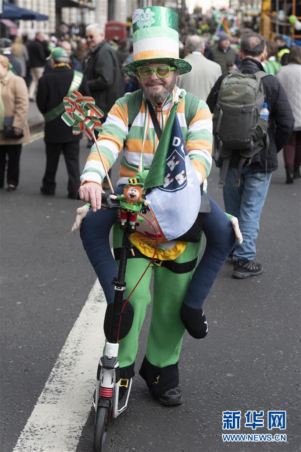 3月17日,在英国伦敦,一名男子参加圣帕特里克节游行。当日,圣帕特里克节游行在英国伦敦举行。每年3月17日的圣帕特里克节是爱尔兰传统节日,为纪念爱尔兰守护神圣帕特里克而设立。新华社发(雷伊·唐摄)