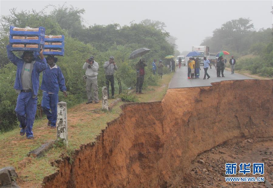 3月18日,在津巴布韦马尼卡兰省的奇马尼马尼,运送食品的工作人员走过塌方路段。 津巴布韦官员17日晚说,15日晚开始袭击该国东部的强热带气旋“伊代”已造成津巴布韦70人死亡,数百人失踪。目前气旋中心已离开津巴布韦,救灾工作正在展开。 新华社发(肖恩·朱萨 摄)