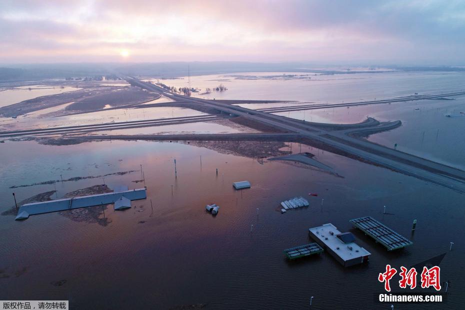 当地时间2019年3月18日,受“炸弹气旋”影响,爱荷华州、内布拉斯加州和其他中西部州遭遇极端天气,暴雨冰冻导致河流暴涨,居民被迫撤离。内布拉斯加州东部河流沿岸的数千人被敦促撤离。