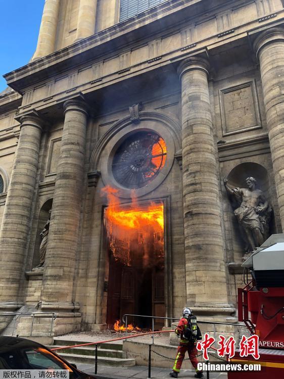 法国圣叙尔比斯教堂着火 消防员紧急扑救