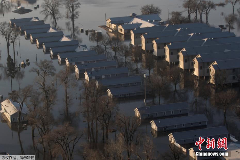 据报道,美国中西部地区近日连降大雨、积雪融化,多地水位升至历史新高,内布拉斯加州遭遇50年来最严重洪灾。图为内布拉斯加州阿什兰国民警卫队营地遭洪水淹没。