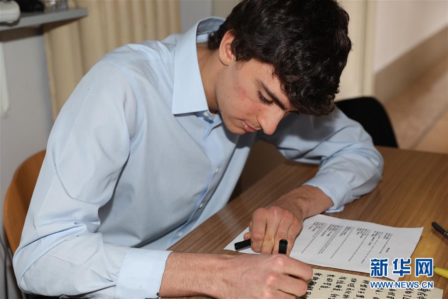 3月18日,意大利罗马国立住读学校高中五年级男生乔瓦尼在抄写自己写的诗。 新华社记者 程婷婷 摄