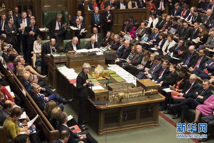 3月20日,在英国伦敦,英国首相特雷莎·梅(中)出席议会下院进行的首相问答。 英国首相特雷莎·梅20日在议会下院说,她已向欧盟递交信函,正式提出推迟英国“脱欧”的申请。 新华社发(英国议会摄影师马克·达菲 摄)