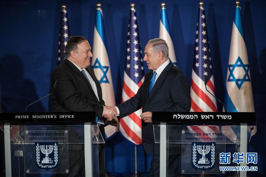 美国总统特朗普3月21日在社交媒体上说,美国应承认以色列对戈兰高地的“主权”。阿拉伯国家联盟(阿盟)发表声明对此予以批评。就此表态,以色列总理内塔尼亚胡当天在与到访的美国国务卿蓬佩奥发表的联合声明中说,在承认耶路撒冷为以色列首都并完成使馆搬迁后,特朗普又做出一个历史性举动。他感谢美国对以色列安全和自卫权的支持。 3月21日,在耶路撒冷,以色列总理内塔尼亚胡(右)与到访的美国国务卿蓬佩奥在记者招待会上握手。 新华社/基尼图片社
