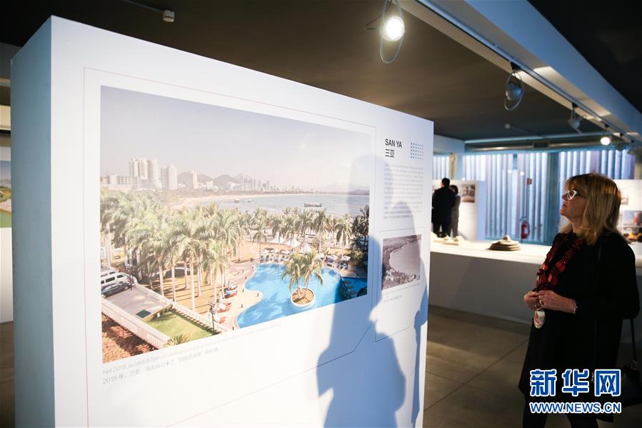 3月22日,参观者在意大利罗马举行的“千亿像素看中国——城市与人”互动主题展上观看展示中国三亚的照片。
