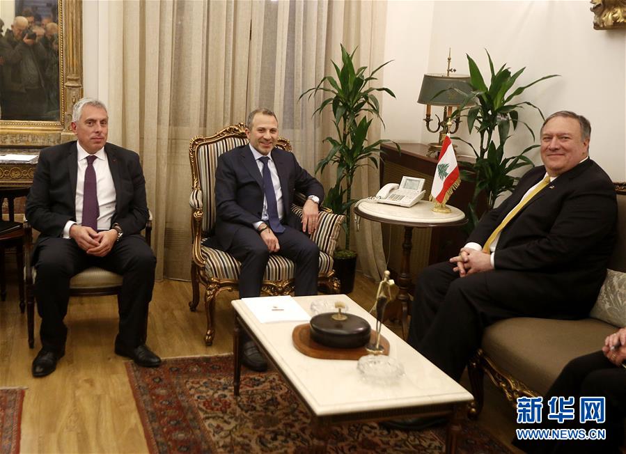 3月22日,黎巴嫩外长吉卜兰·巴西勒(中)在位于黎巴嫩首都贝鲁特的外交部与到访的美国国务卿蓬佩奥(右)举行会谈。新华社发(比拉尔·贾维希摄)
