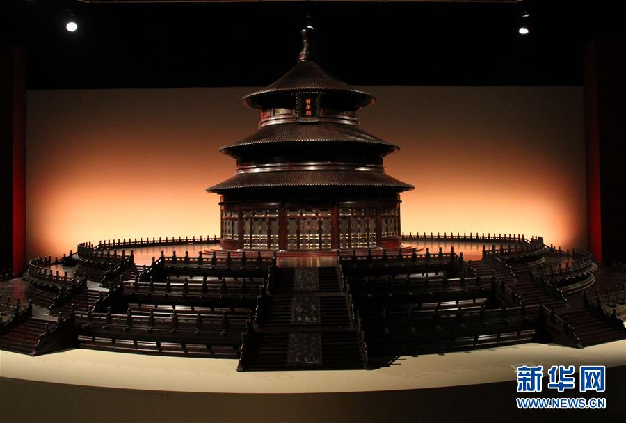 这是2017年7月13日在摩纳哥蒙特卡洛举行的故宫文物展上拍摄的天坛祈年殿模型。新华社记者 张曼 摄