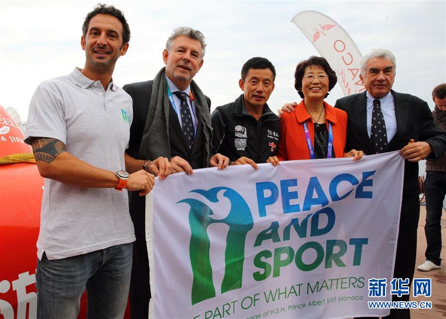 这是2015年12月21日,在摩纳哥游艇俱乐部,中国远洋航行第一人郭川(中)与摩纳哥游艇俱乐部秘书长伯纳德·德亚历山德罗(右一)等合影。新华社发(郭川团队供图)