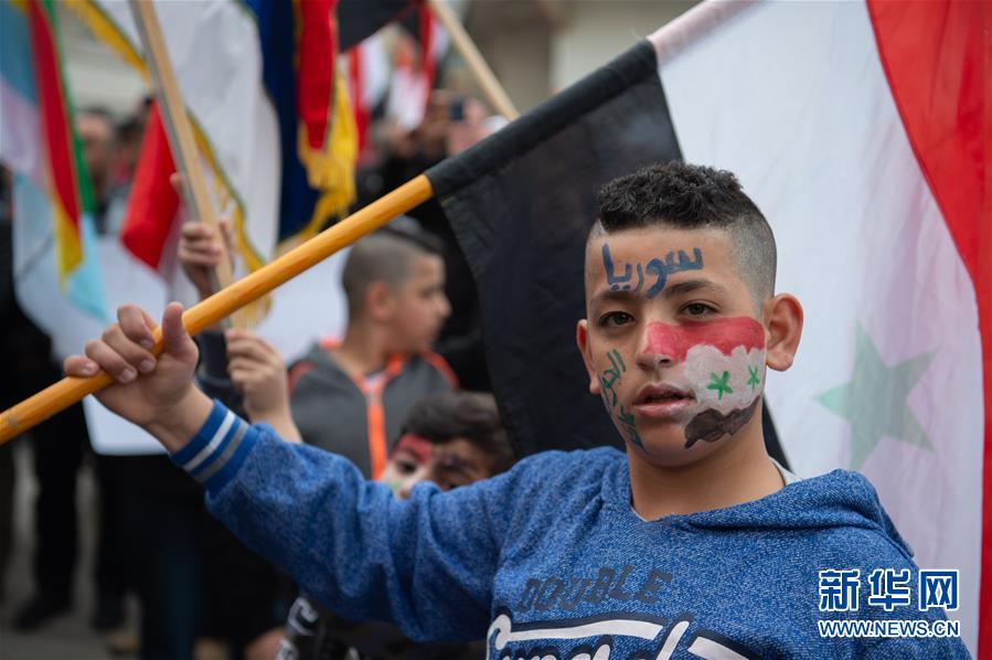 3月23日,一名戈兰高地的德鲁兹儿童举着叙利亚国旗在迈季代勒舍姆斯参加抗议活动,反对美国总统有关戈兰高地的言论。