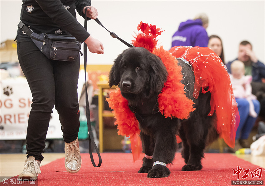 当地时间2019年3月24日,英国韦瑟比,当地举行狗狗选美比赛,汪星人穿华丽外衣变身“超模”。