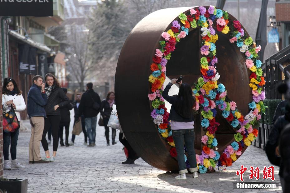 当地时间3月24日,在加拿大多伦多知名的古酿酒厂步行休闲区,一个以花束装饰的艺术装置吸引游人目光。周末多伦多气温明显上升,不少民众外出享受春日暖阳。中新社记者 余瑞冬 摄