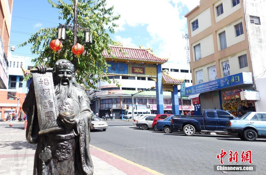 在多米尼加首都圣多明各,“招财进宝”财神雕像竖立在“唐人街”街头。中新社记者 莫成雄 摄
