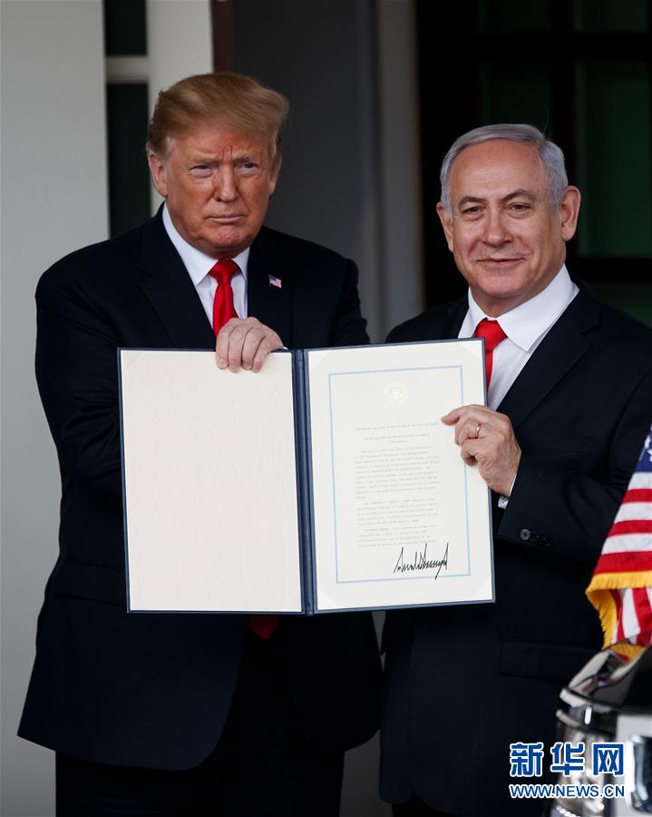 3月25日,在美国首都华盛顿白宫,美国总统特朗普(左)与以色列总理内塔尼亚胡展示特朗普签署的正式承认以色列对戈兰高地的主权的公告。 美国总统特朗普25日正式承认以色列对戈兰高地的主权。叙利亚、俄罗斯、阿拉伯国家联盟等国家和组织随后表示反对,警告此举或引发地区局势新动荡。 新华社发(沈霆摄)
