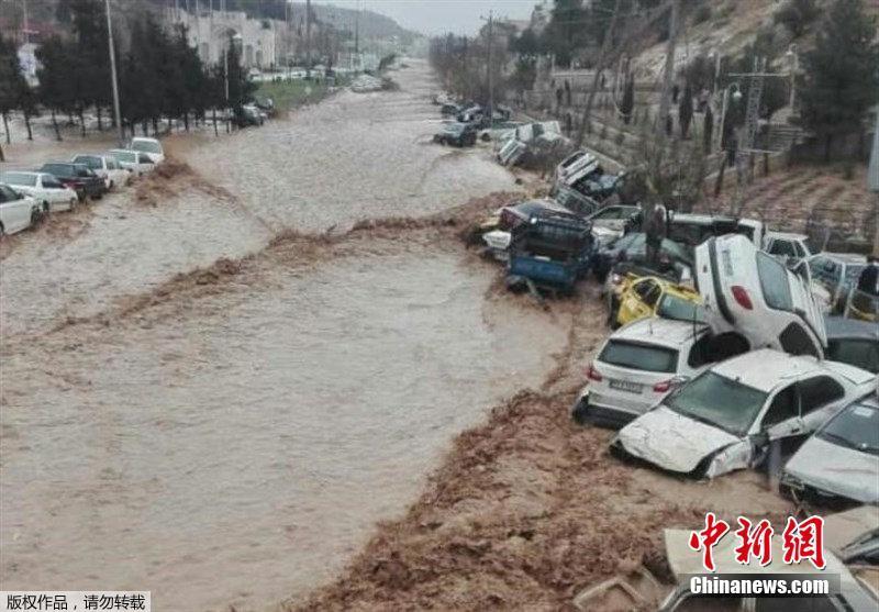 伊朗遭遇洪水袭击 街边轿车被冲“叠罗汉”