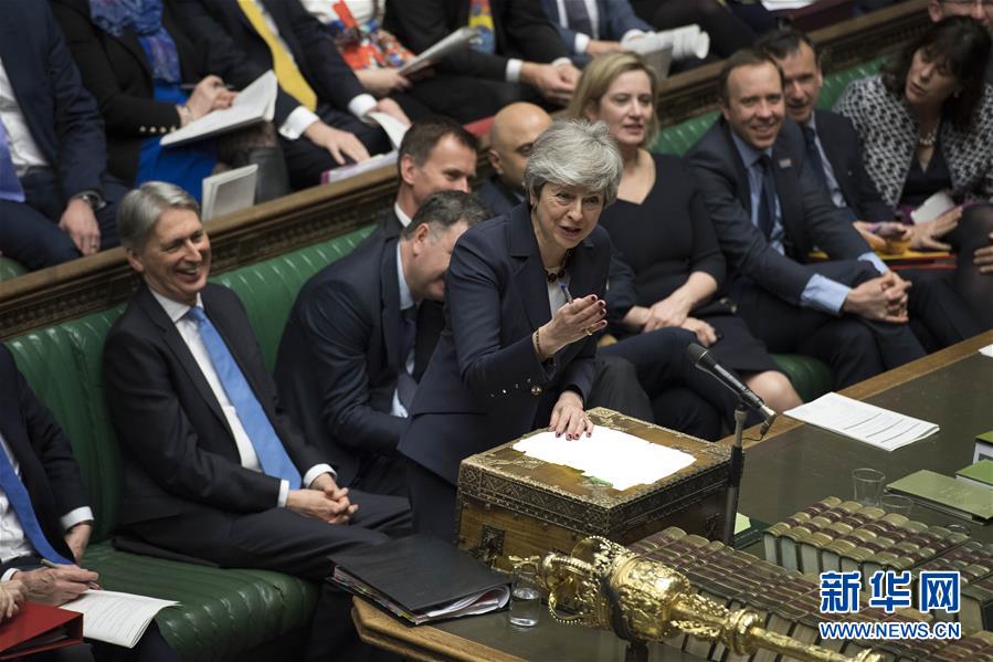 3月27日,在英国伦敦,英国首相特雷莎·梅(前)在议会下院进行首相问答。英国议会下院27日投票表决,正式确认推迟原定于本月29日的“脱欧”。目前“脱欧”最终期限仍未确定。 新华社发(英国议会摄影师杰西卡·泰勒摄)