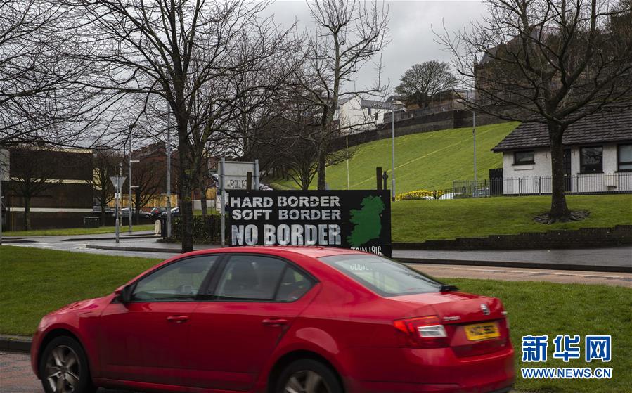 3月18日,在英国北爱尔兰第二大城市德里,一辆汽车从写有“硬边界,软边界,无边界”的宣传牌旁驶过。 新华社记者 韩岩 摄