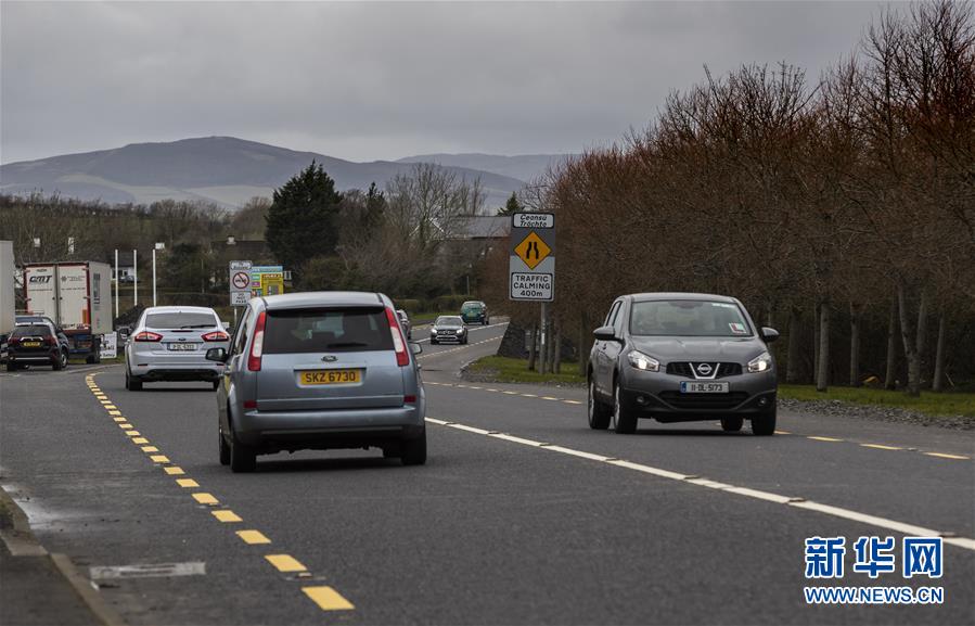这是3月18日拍摄的在英国北爱尔兰第二大城市德里与爱尔兰共和国的边界线上来往的车辆。 新华社记者 韩岩 摄