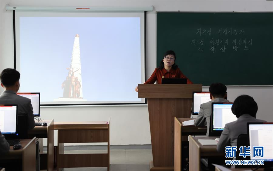 3月25日,在朝鲜平壤金亨稷师范大学,一名教师为语文学部作家培养班的大三学生们上课。 新华社记者程大雨摄