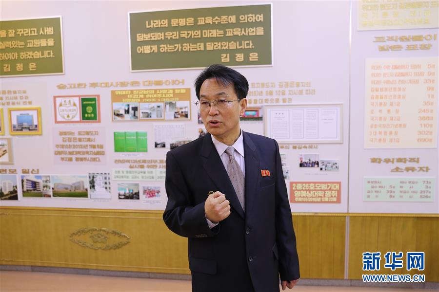 3月25日,在朝鲜平壤金亨稷师范大学,副校长金日焕在校史展览室介绍学校的历史发展。 新华社记者程大雨摄