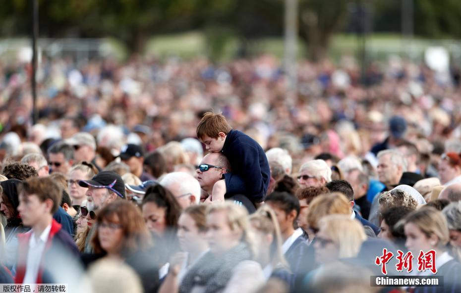 当地时间3月29日,新西兰在克赖斯特彻奇市哈格利公园举行国家纪念仪式,致哀清真寺枪击案遇难者。图为纪念仪式上,一名男孩儿坐在大人肩上。