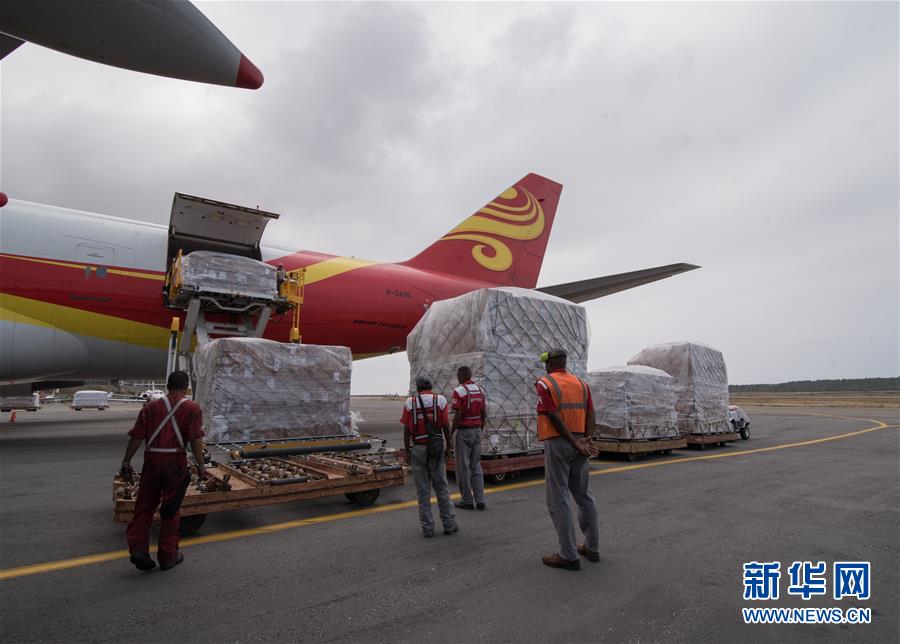 3月29日,工作人员从飞机上卸载运抵委内瑞拉首都加拉加斯西蒙·玻利瓦尔国际机场的民生物资。 新华社发(萨尔加多 摄)