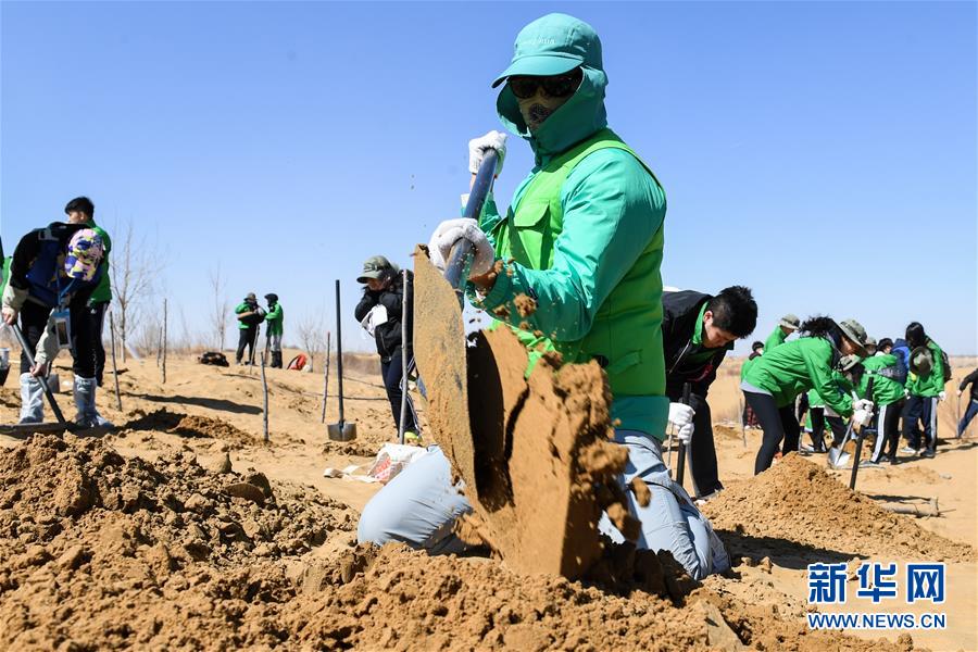 3月31日,参与植树活动的青年志愿者在挖沙坑。 当日,200余名中韩两国青年志愿者来到内蒙古自治区达拉特旗库布其沙漠种树。2006年起,中国国际青年交流中心与韩国韩中文化青少年协会组织两国青年志愿者在库布其沙漠植树,参与防沙固沙项目。截至目前已植树850多万株,造林3万多亩。 新华社记者 刘磊 摄