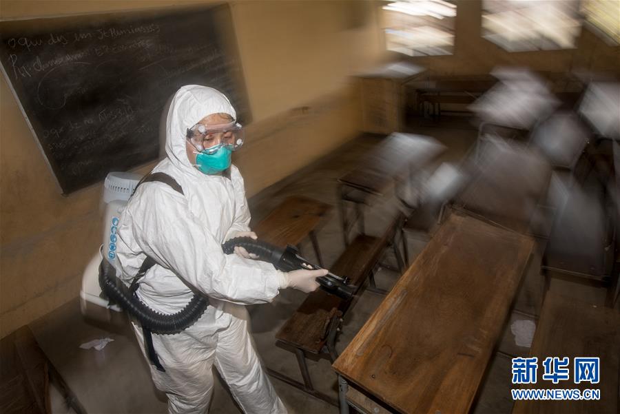 3月29日,在莫桑比克索法拉省贝拉市,中国救援队成员在卡布拉尔小学的教室喷洒消毒药剂。