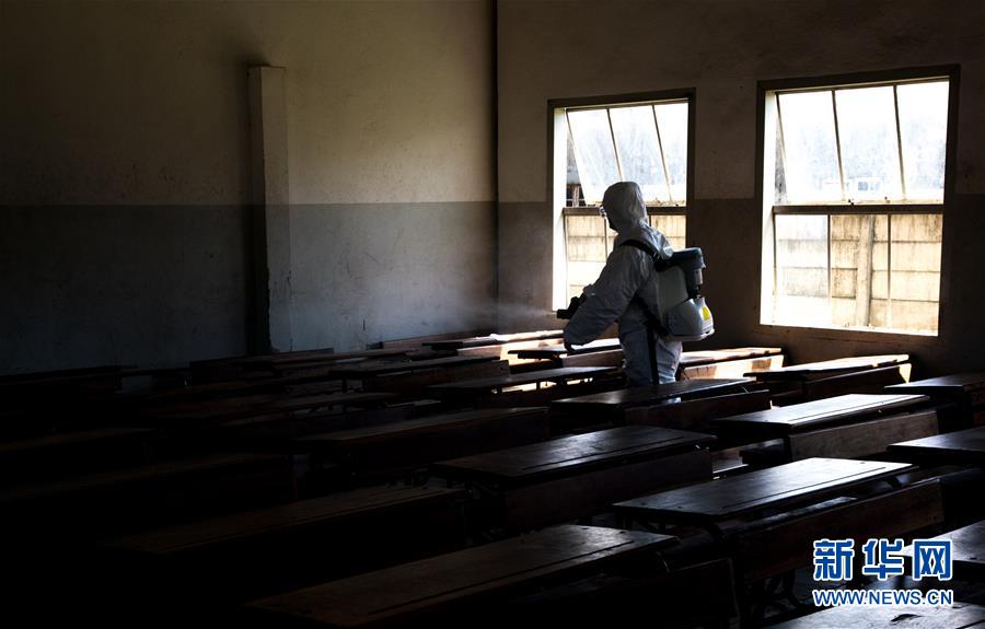 3月29日,在莫桑比克索法拉省贝拉市,中国救援队成员在一所小学的教室喷洒消毒药剂。
