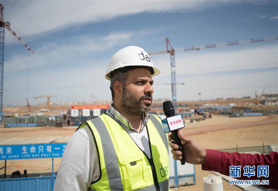 3月12日,在埃及开罗以东50公里的新行政首都中央商务区建设项目上,埃及工程监理方总监艾哈迈德·班纳接受新华社记者采访。初春时节,在埃及首都开罗以东50公里的新行政首都中央商务区建设工地上,重型卡车、推土机、挖掘机不停穿梭,中国建筑股份有限公司(简称“中国建筑”)的中方员工与埃及合作伙伴的施工作业正在紧锣密鼓地进行。新华社记者 邬惠我 摄