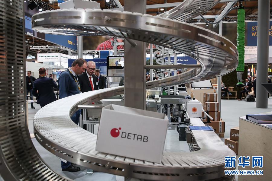 4月1日,在德国汉诺威,参观者在汉诺威工博会上观看瑞典展区展出的传送带。当日,2019年汉诺威工业博览会(工博会)正式开门迎客,并将持续至4月5日。本届工博会主题为“融合的工业——工业智能”,共吸引来自全球75个国家和地区的6500家参展商参展,参观人数预计将超过22万。 新华社记者单宇琦摄
