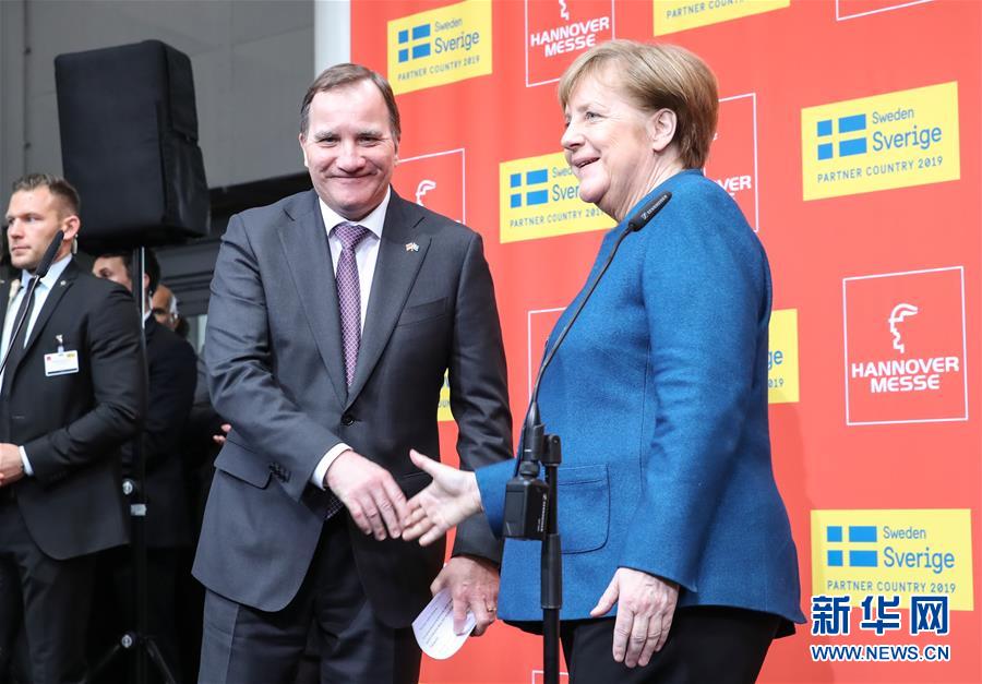 4月1日,在德国汉诺威,德国总理默克尔(前右)与瑞典首相勒文(前左)在参观展馆后握手。当日,2019年汉诺威工业博览会(工博会)正式开门迎客,并将持续至4月5日。本届工博会主题为“融合的工业——工业智能”,共吸引来自全球75个国家和地区的6500家参展商参展,参观人数预计将超过22万。 新华社记者单宇琦摄