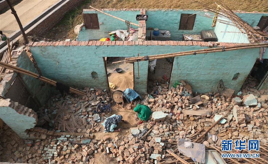 4月2日,在尼泊尔巴拉区,当地居民在被风暴破坏的房屋内忙碌。 新华社发(苏尼尔·夏尔马摄)