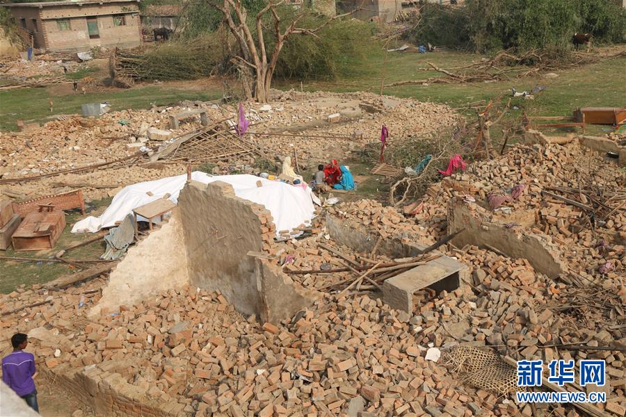 4月2日,在尼泊尔巴拉区,人们在风暴灾难现场休息。 新华社发(苏尼尔·夏尔马摄)