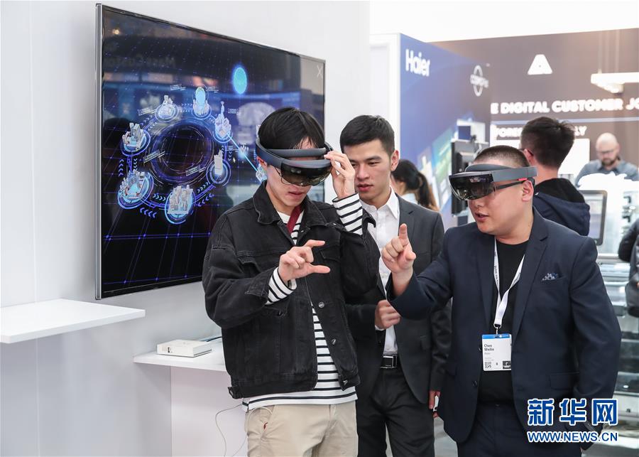 4月1日,在德国汉诺威,一名参观者(左)在海尔展区体验MR(混合现实)设备。 2019年汉诺威工业博览会4月1日至4月5日在德国汉诺威举行。本届展会共吸引来自全球75个国家和地区的6500家参展商,其中,中国展商数量仅次于东道主德国。 新华社记者 单宇琦 摄