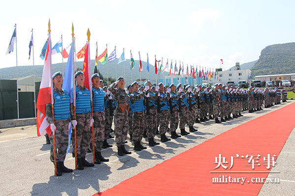 方队人员向联合国会旗、中国国旗和黎巴嫩国旗敬礼