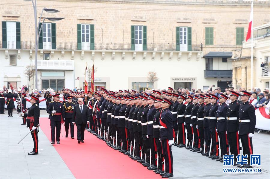 4月4日,维拉在马耳他首都瓦莱塔圣乔治广场检阅仪仗队。 马耳他前外交部长维拉4日在瓦莱塔总统府大公宫宣誓就任总统,接替到任的总统普雷卡。 新华社记者 袁韵 摄