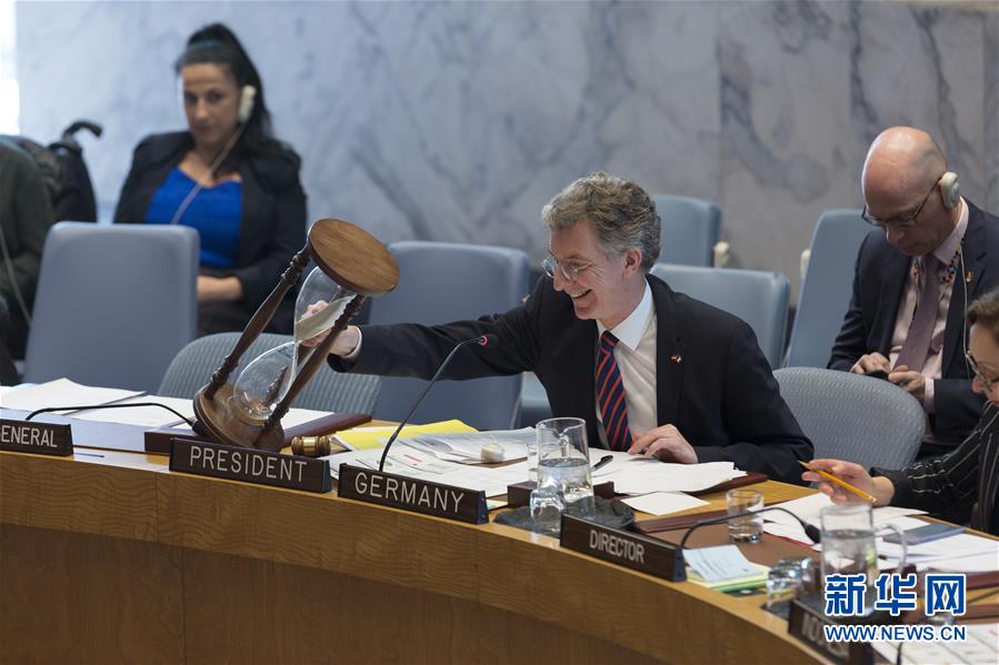 4月3日,在位于纽约的联合国总部,安理会本月轮值主席、德国常驻联合国代表克里斯托弗·霍伊斯根(中)手持沙漏主持海地问题公开会。 新华社记者 李木子 摄