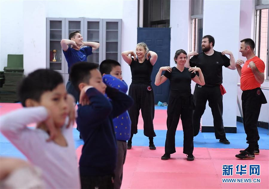 4月3日,尼尔(右一)在福建省福州实验小学和英国朋友以及孩子们一起做地术拳表演前的准备。 新华社记者 林善传 摄