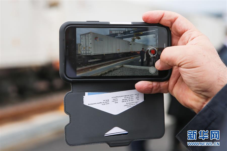 4月4日,一名嘉宾在卢森堡迪德朗日铁路场站拍摄首趟卢森堡至成都中欧班列。新华社记者郑焕松摄
