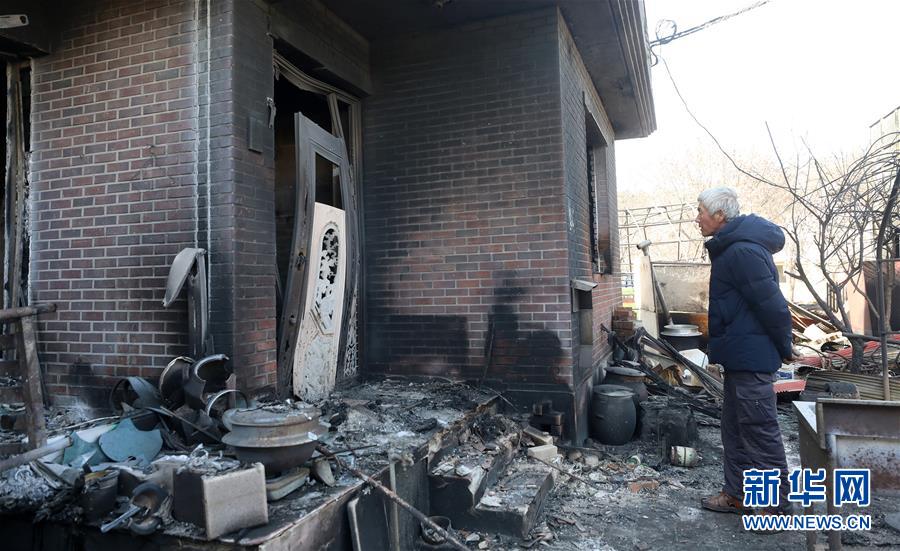 4月5日,在韩国束草,一名男子看着自己被烧毁的房屋。 韩国东部江原道一带发生的大规模山林火灾5日被基本扑灭。韩国政府宣布此次山火为“国家灾难”。 新华社/纽西斯通讯社