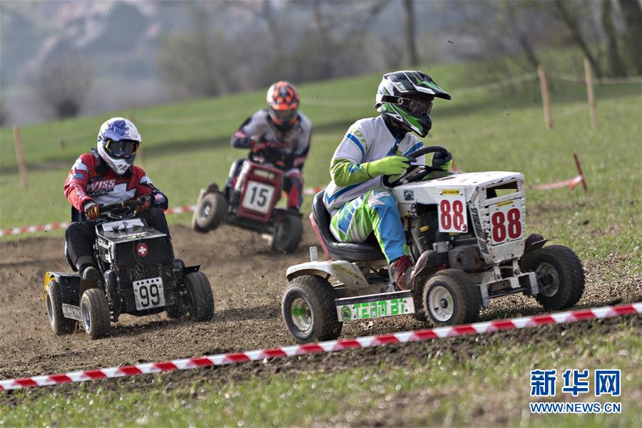 4月6日,在瑞士苏黎世附近的上格拉特镇,选手参加割草机大赛。 当日,一场别开生面的割草机大赛在上格拉特镇举行,吸引了来自瑞士、德国和卢森堡的近三十名选手参加。 新华社发(米歇尔·立米纳 摄)