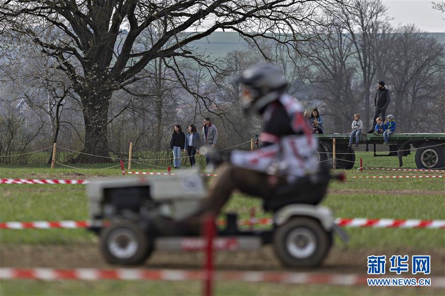 4月6日,在瑞士苏黎世附近的上格拉特镇,一名选手参加割草机大赛。 当日,一场别开生面的割草机大赛在上格拉特镇举行,吸引了来自瑞士、德国和卢森堡的近三十名选手参加。 新华社发(米歇尔·立米纳 摄)