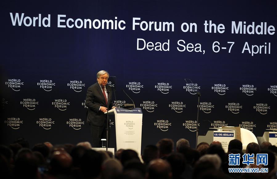 4月6日,在位于约旦死海畔的约旦侯赛因国王会议中心,联合国秘书长古特雷斯在第17届世界经济论坛中东北非峰会上致辞。 第17届世界经济论坛中东北非峰会当地时间6日在约旦侯赛因国王会议中心开幕,来自50多个国家的1000多名政商界人士将围绕峰会主题“构建新的合作平台”展开探讨和对话。 新华社发(穆罕默德·阿布·高希 摄)