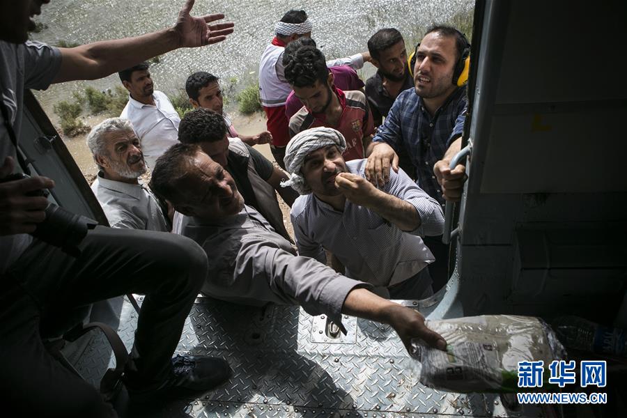 4月6日,在伊朗胡齐斯坦省,民众领取救援物资。伊朗西南部持续强降雨迄今确认致死至少70人。 新华社发(艾哈迈德·哈拉比萨斯摄)