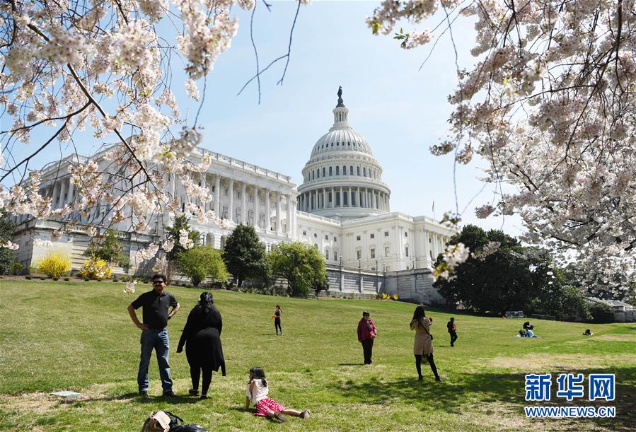 4月6日,人们在美国首都华盛顿的国会山欣赏樱花。新华社记者 韩芳 摄
