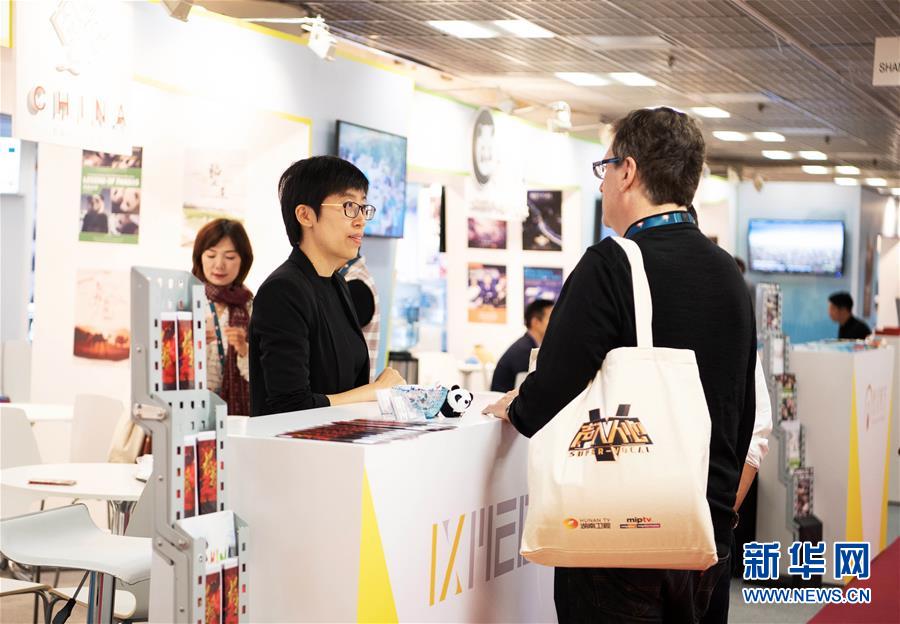 4月8日,在法国戛纳春季电视节上,来宾在一处中国展台前咨询。 2019戛纳春季电视节近日在法国南部海滨小城戛纳举行。中国展团带来的多部电视剧、纪录片、动画片受到海外人士关注。 新华社发(杰克·陈摄)