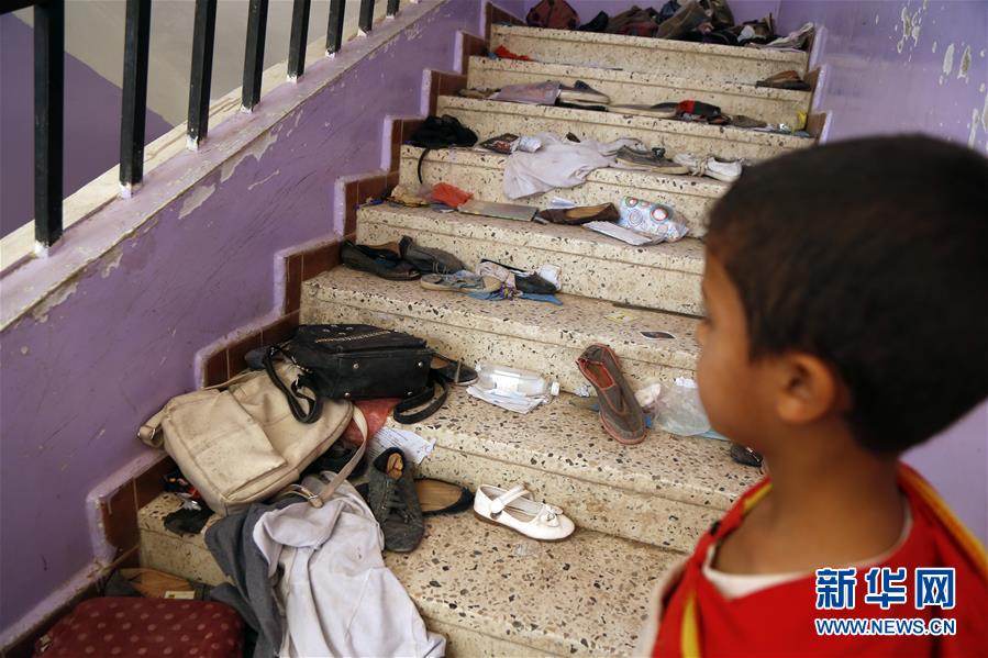 4月8日,在也门萨那,一名男孩在空袭过后站在学校的走廊上。 也门胡塞武装7日说,沙特阿拉伯领导的多国联军当天对也门首都萨那实施空袭,造成至少11人死亡、39人受伤,其中大部分是学生。 新华社发(穆罕默德摄)
