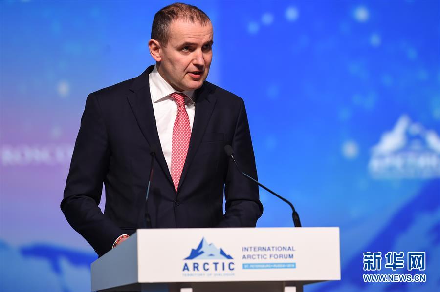 4月9日,在俄罗斯圣彼得堡,冰岛总统约翰内松出席第五届“北极-对话区域”国际北极论坛。 第五届“北极-对话区域”国际北极论坛9日在俄罗斯圣彼得堡开幕。来自世界多国的2000多名代表就北极开发、环保和国际合作等问题进行探讨和交流。 新华社发(叶甫盖尼·西尼岑摄)